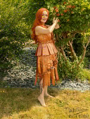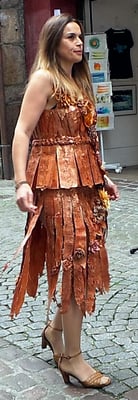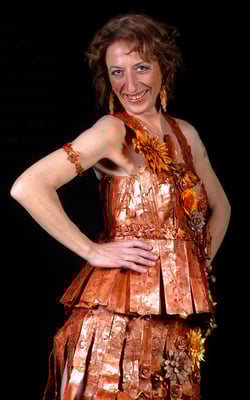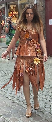 The dress is initially crafted from pristine white paper. This material is then meticulously cut, torn, folded, aged, and patinated to achieve coppery hues that