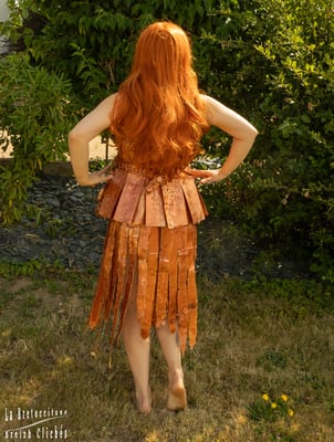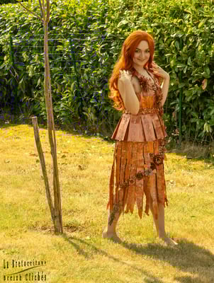 La robe évoque la chaleur douce des jours d’automne, avec ses teintes cuivrées et son allure raffinée.